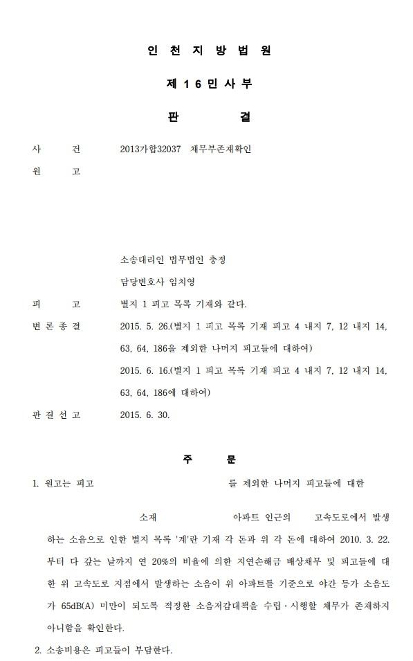 고속도로 인근에 축조된 부평 소재 아파트 주민이 고속도로 설치자인 한국도로공사를 상대로 환경분쟁조정중재원에 소음저감대책이행청구를 제기하여 주민승소 결정이 난 사례에서 그러한 채무가 없음을 이유로 채무부존재확인소소을 제기하였는데, 고속도로 설치 시점이 선행하는 점, 현대사회에서 고속도로의 필수성과 공공성 등을 입증하여 소음저감대책을 강구할 책임이 없음이 확인. 전부승소