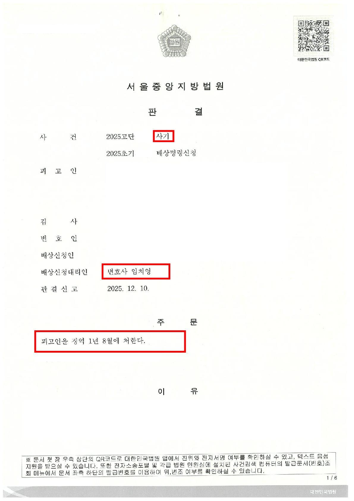 고소인 진술, 수차례의 참고인 조사 및 대질 신문 등의 절차를 통하여 형사 기소가 되었고, 형사 재판 후 결국 1년 8개월의 실형 선고 후 법정 구속.